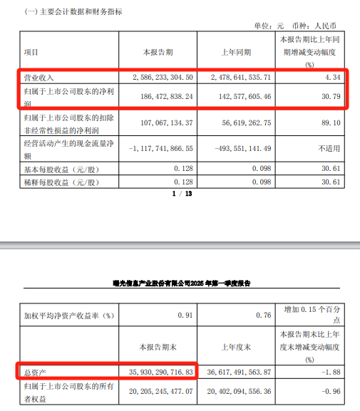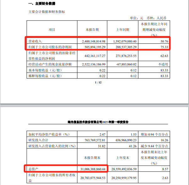 2025年第一季度,海光信息、中科曙光的营业收入分别为24.00亿元、25.86亿元,同比分别增长50.76%、4.34%;截至2025年第一季度末,海光信息、中科曙光的总资产分别为310.06亿元、359.30亿元。
